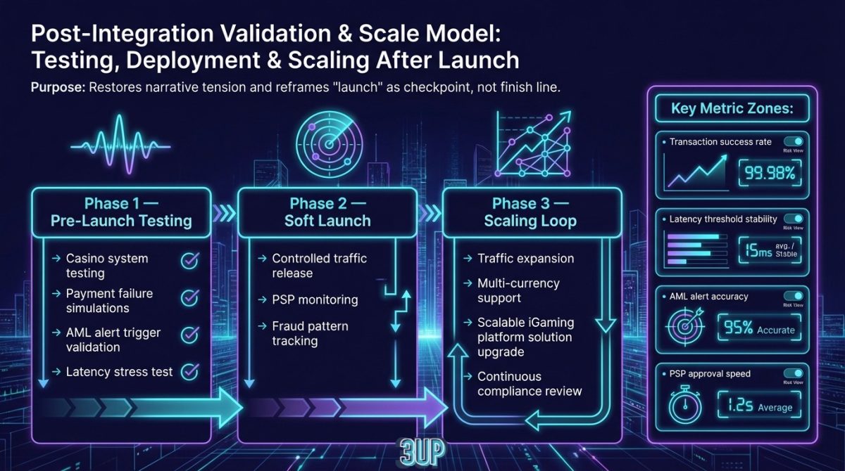 The fundamental stack (e.g. PAM, game aggregation, payments, KYC) need to be tested and verified successively. Misconfiguration is the major cause of launch failure.
