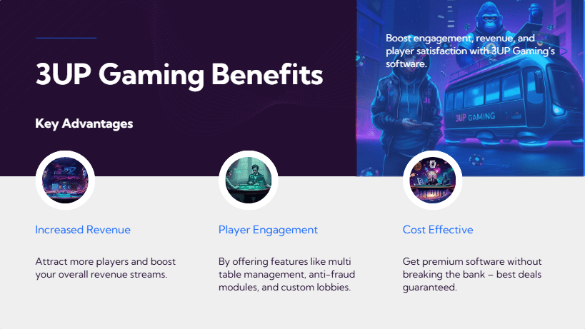 Best Deals on sale poker software for iGaming providers! If you are growing your online poker platform what you don’t want is slow setup, rigid tools, or software that is overpriced with hidden limitations. That’s what 3UP Gaming provides they bring real value right out of the box.