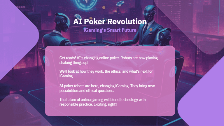 Robot Playing AI Poker: The Future of Online iGaming! Let out the tech buzzwords a bit. By which I mean when we talk of “poker playing robots” we aren’t at all to picture a metal man passing out chips on your living room table. What we are to picture is AI based software agents computer players that we designed to use human like strategies in online games.