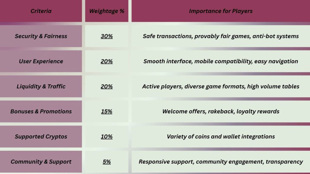 With so many crypto poker rooms to select from, not all are worth your chips. In an attempt to make this list as helpful and well-balanced as possible we tested each room with player-centric criteria.