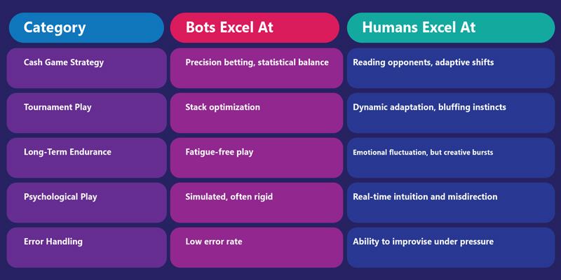 Robots benefit from fixed cash games because of their mathematical advantage, but dynamic tournaments force robots to be more adaptable. At higher levels, emotional intelligence surpasses logic. Humans are better at reading signals, improvising during gameplay, and spotting their opponents’ weaknesses.