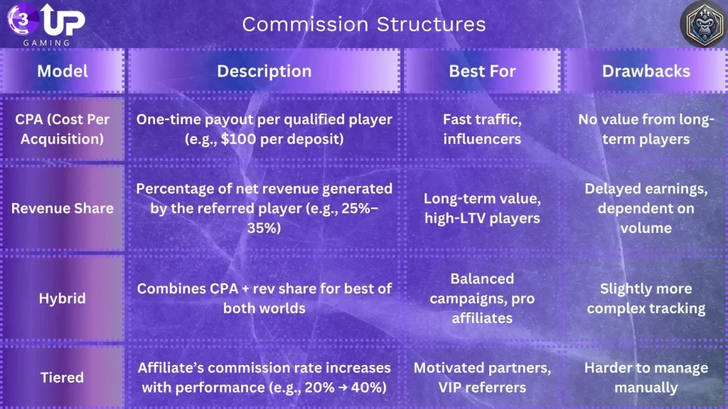 CPA, revenue share, hybrid; configurable per affiliate or group.