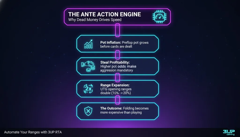 - Range Expansion: In cases where antes increase the pot odds and dead money, the player must act in a strategic manner by expanding the number of hands that ought to be played.
