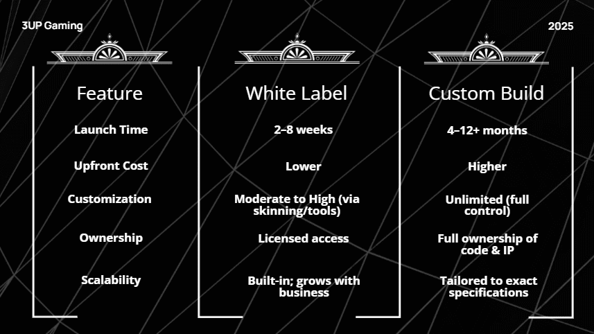 Let’s look at the numbers. At 3UP Gaming we see the cost of a white label solution dependent upon the provider and which features you choose, but this is how we break it out:
