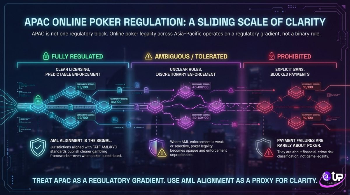 In Asia and the Pacific, online poker Laws in Asia On the one hand, fully regulated markets have tolerated-but-uncodified environments, and on the other, online poker is prohibited completely. The problem that is frustrating is not prohibition itself, but vagueness; areas in which there is enforcement without clear rulebooks.